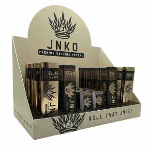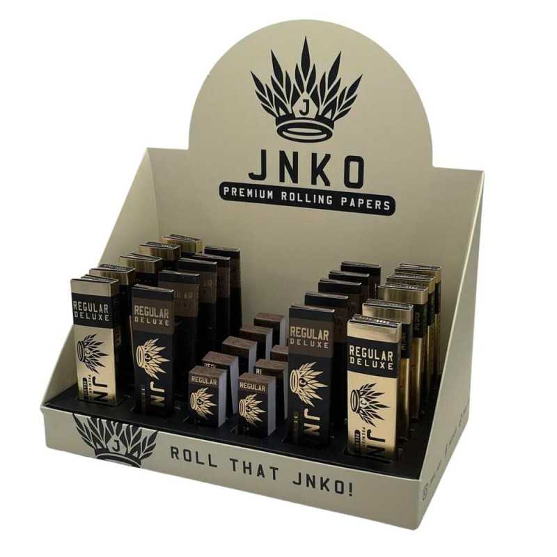 Naše stojany JNKO Regular Deluxe jsou ideálním řešením pro velkoobchody a obchody, které chtějí svým zákazníkům nabídnout kvalitní dlouhé kapesníky a filtrační špičky. Každý stojan obsahuje 10 balení JNKO Regular Deluxe dlouhých kapesníků, 10 knížek JNKO Regular Deluxe filtračních špiček a 10 JNKO kombinovaných balení Regular Deluxe kapesníků + špiček, což vám poskytuje dostatečnou zásobu k uspokojení poptávky vašich zákazníků. Tyto stojany jsou ideální pro B2B zákazníky a maloobchodníky, kteří chtějí rozšířit svůj sortiment o prvotřídní výrobky na balení. S JNKO Regular Deluxe stojany ve vašem obchodě nebo skladu můžete svým zákazníkům nabídnout charakteristickou kvalitu a styl produktů JNKO.