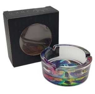 Das Design dieses Glasaschenbechers zeichnet sich durch lebhafte psychedelische Muster und farbenfrohe Elemente aus, die wunderschön auf dem Glasboden zur Geltung kommen. Diese künstlerischen Ergänzungen verleihen dem Aschenbecher sowohl Lebendigkeit als auch Raffinesse und machen ihn nicht nur zu einem funktionalen Gegenstand, sondern auch zu einem auffälligen Accessoire für jeden Raum. Dieser Aschenbecher zieht sofort die Aufmerksamkeit auf sich und steigert Ihr Raucherlebnis.